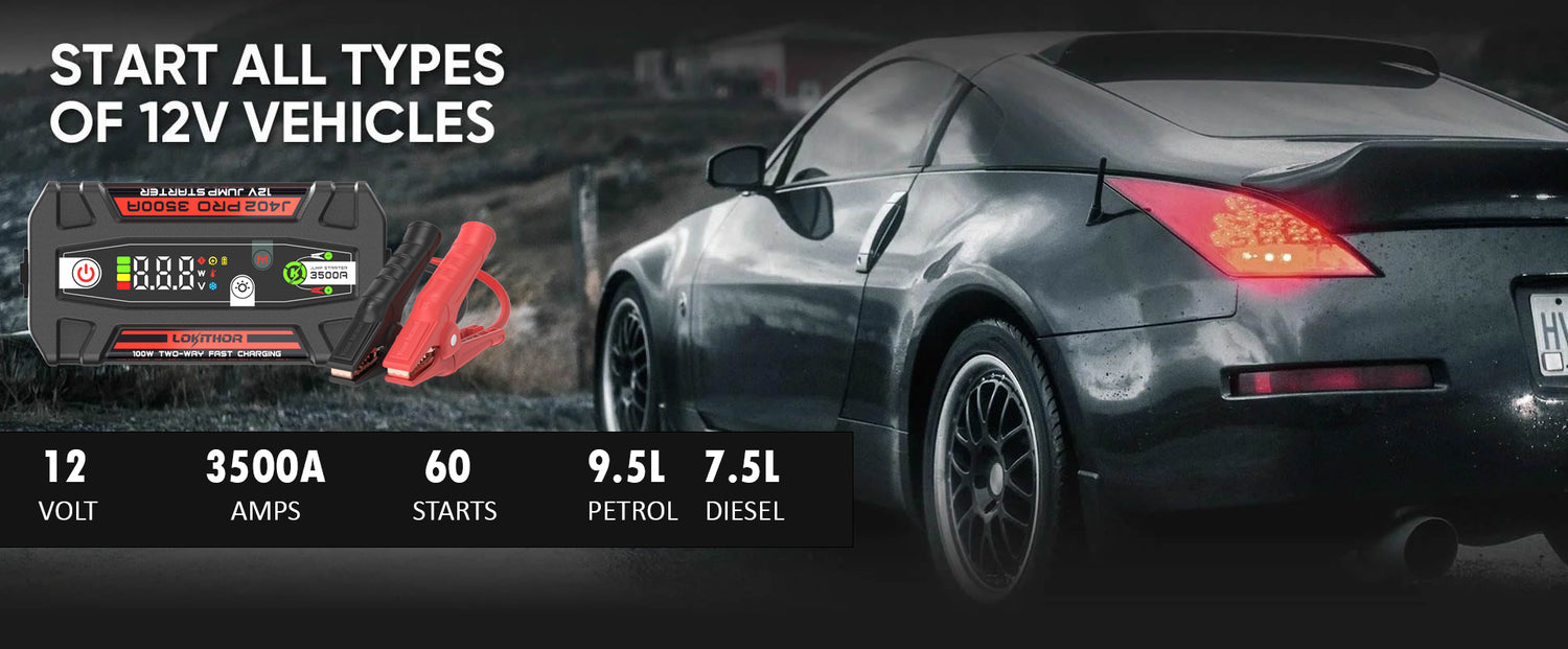 Suitable for jump starting vehicles, vans, 4x4, offroad, farming machinery, motorbikes, jet skis, boats and petrol engines up to 9.5L and 7.5L for diesel.